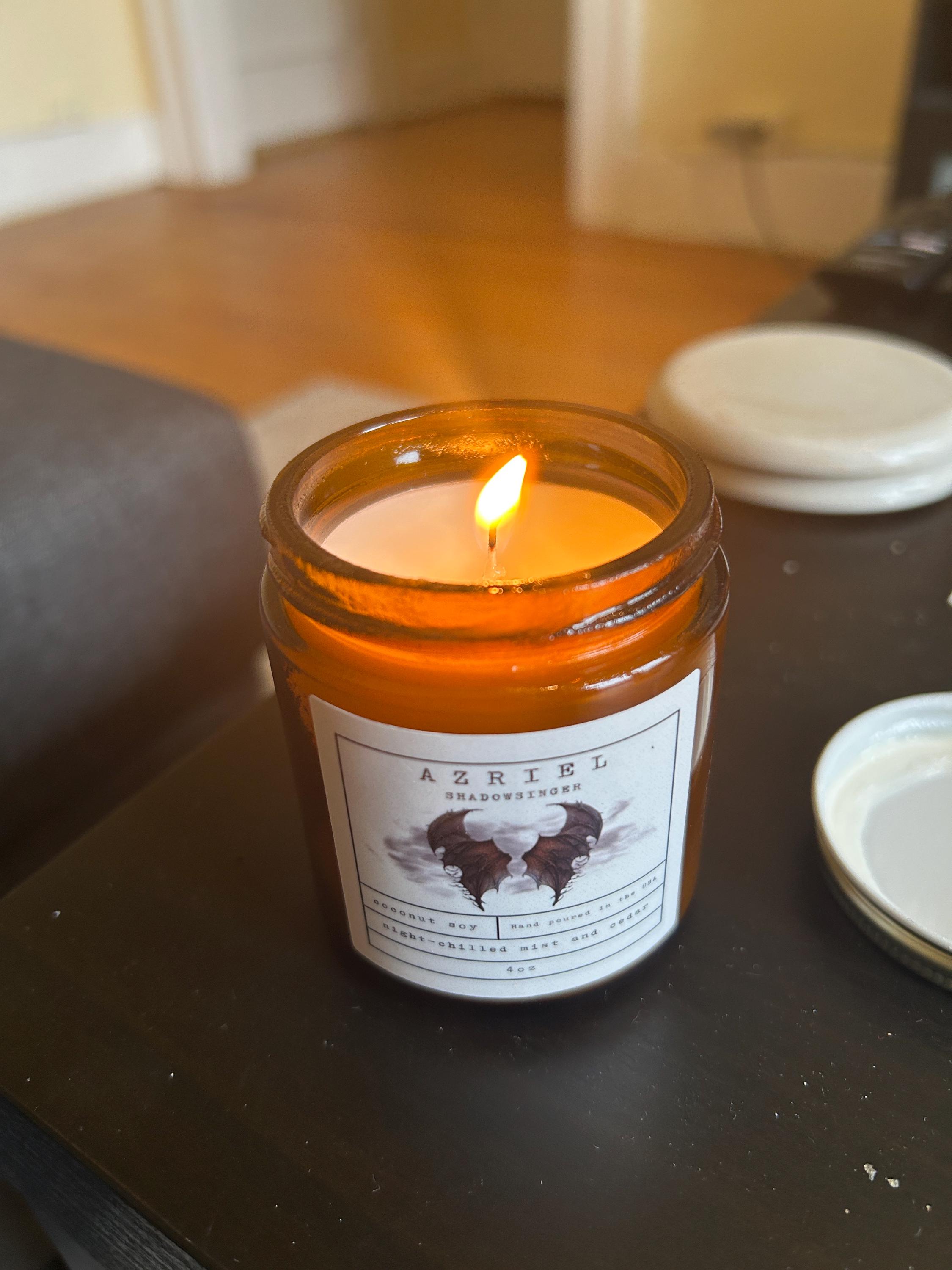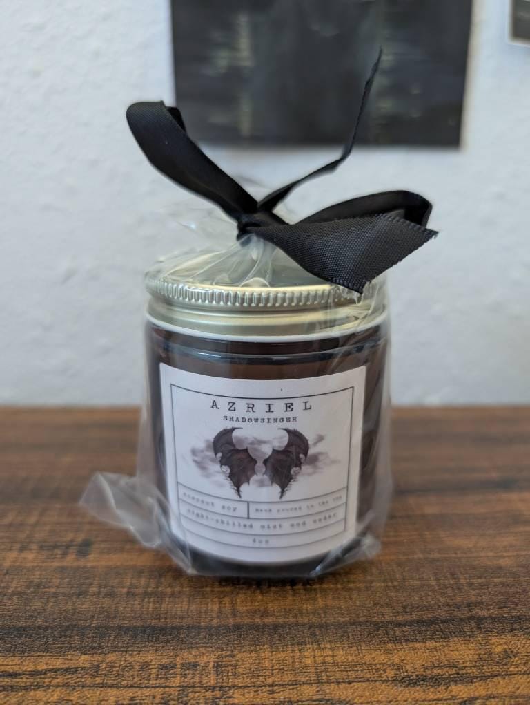 The scent of Azriel. Luxurious top notes of saffron and bergamot are a captivating embrace that lure you in, while the heart's harmony of amber, violet, and cedar serenade your spirit with their rich, comforting symphony. The scent settles over your realm with the grounding power of vetiver and dark musk, delicately balanced by the soft allure of a powdery finish.